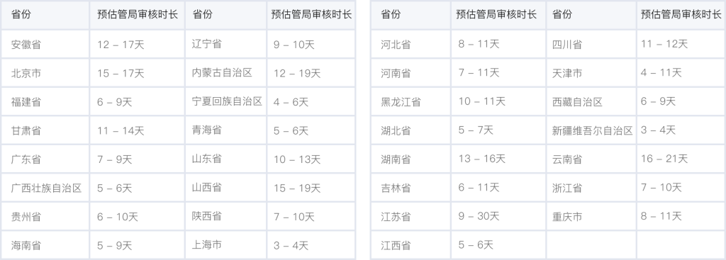 各個(gè)省管局預(yù)計(jì)審核時(shí)長,實(shí)際審核時(shí)長會(huì)根據(jù)備案場景有所不同,下表格僅供參考。詳情可查看 詳細(xì)規(guī)則。